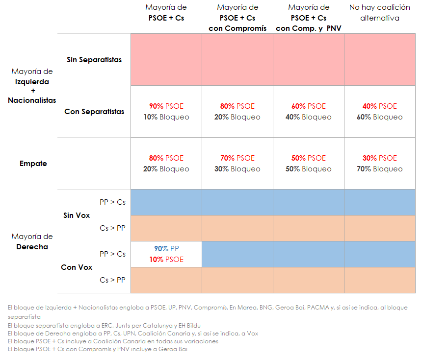En los 8 escenarios restantes, existe un riesgo de bloqueo considerable: 4 escenarios incluyen un empate y los otros 4 repiten la aritmética que ha llevado a este adelanto electoral. Los porcentajes asignados en estos casos son muy subjetivos e incluso especulativos, pero la comparativa entre escenarios se basa en criterios objetivos: El riesgo de bloqueo aumenta conforme disminuye la disponibilidad y viabilidad de coaliciones alternativas.